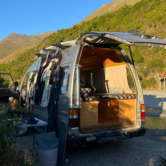 This is Homy - our 1994 Nissan Homy with 213,000 kilometers. I bought it off of some guy who sold it to me for a great deal because he simply wanted Homy to be loved and treated well in its next life (total Homie, thanks Aled). The inside was pre-built out with a warm colored wood and painted mustard yellow over the previous metal. The benches turn into the bed (quite comfy dare I say) and underneath the benches is our storage. The left side contains our clothes (mostly mine) and a separate drawer where our chiller lives (chilly bin as the kiwis say). On the right, we store our bedding, extra bags/suitcases, and our toilet. No, we have never used it and no, we never will. Ronan stores one of his boards above our bed in our inside surf rack for easy access. I scored most of our bedding from a thrift shop in Wanaka which consists of a pink comforter and a flower patterned mattress topper/bottom sheet that fits so perfectly I think it was made for Homy along with some pink pillow cases that were gifted to me from my friend Frances. It’s a girls bed and I love it.